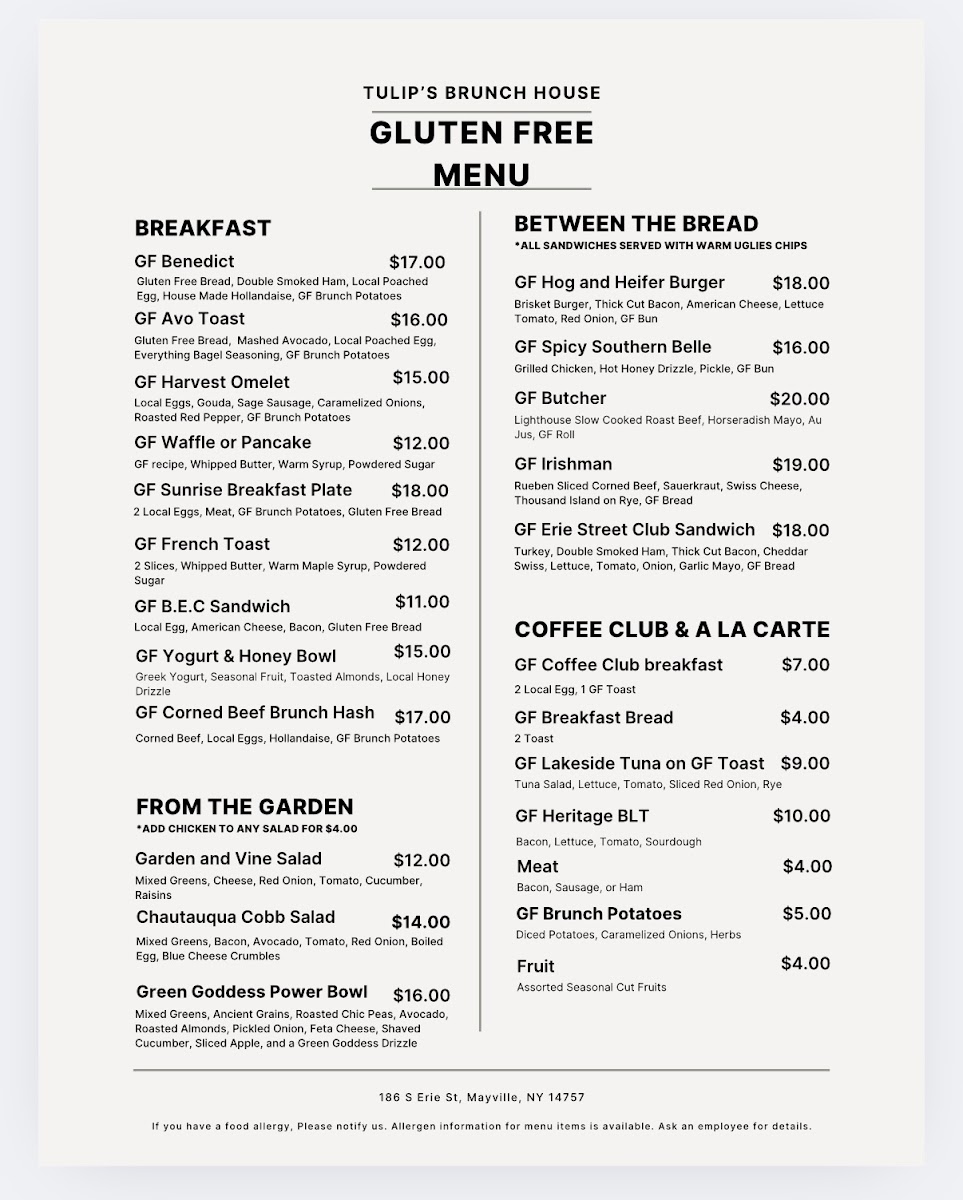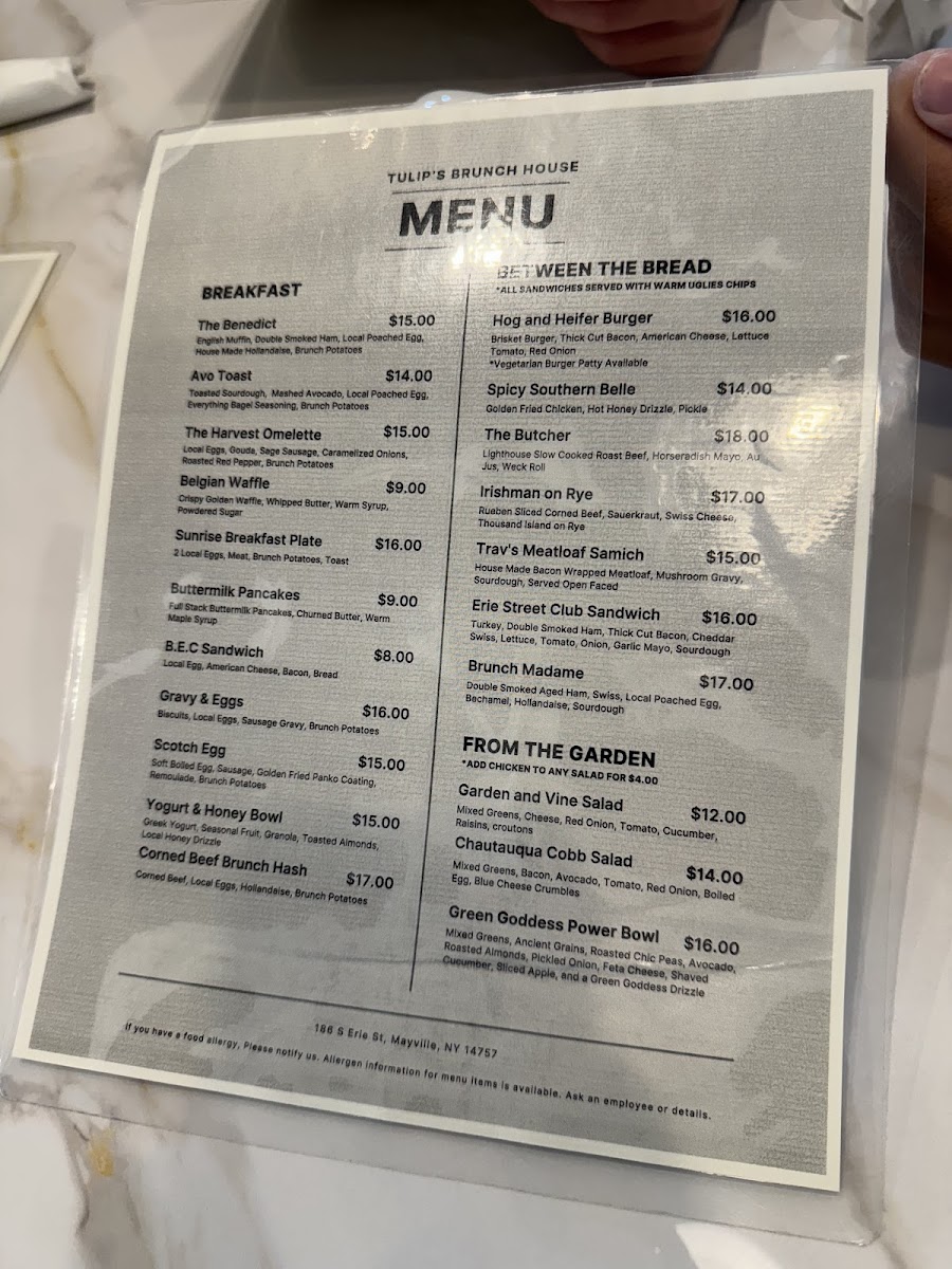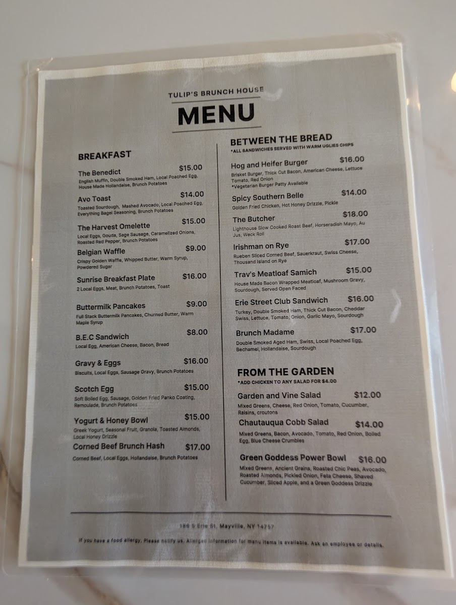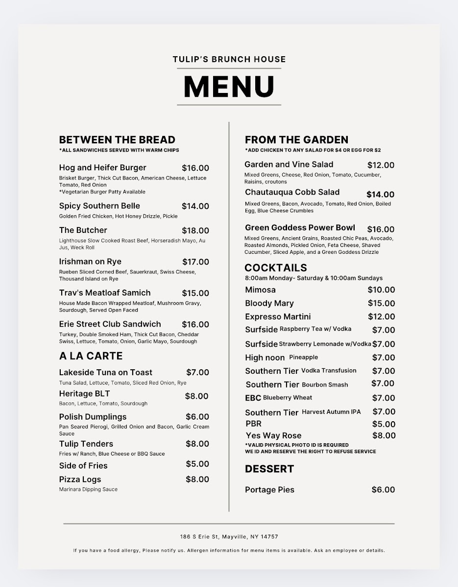 At Tulip's Brunch House Menu, located at 186 S Erie St, Mayville, NY, you'll find a delightful selection of dishes perfect for any brunch craving. Whether you're in the mood for a hearty, savory meal or something light and fresh, there's something to satisfy every appetite. From fluffy pancakes to flavorful omelets, each dish is crafted with care using the finest ingredients. And, of course, don't forget to pair your meal with one of their signature beverages-whether it's a freshly brewed coffee or a refreshing mimosa. The menu at Tulip’s is designed to offer comfort and joy in every bite, making it the perfect spot to gather with friends or family for a relaxed, delicious dining experience.