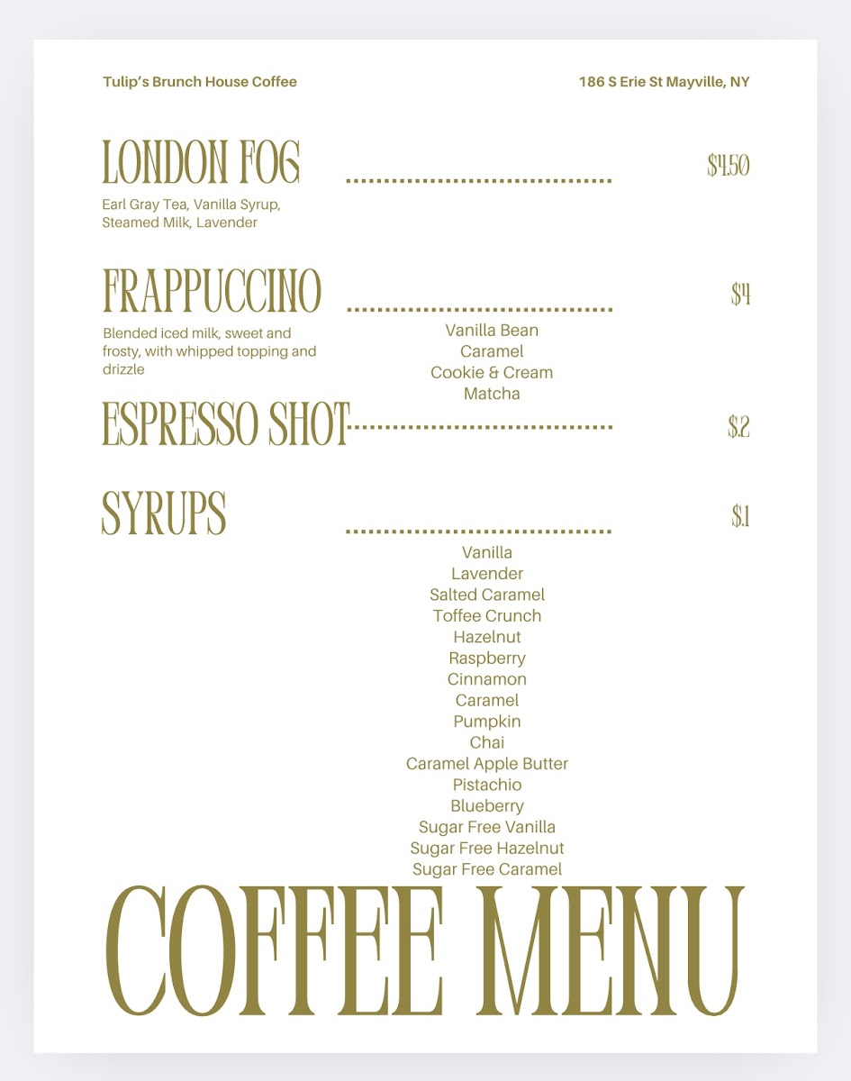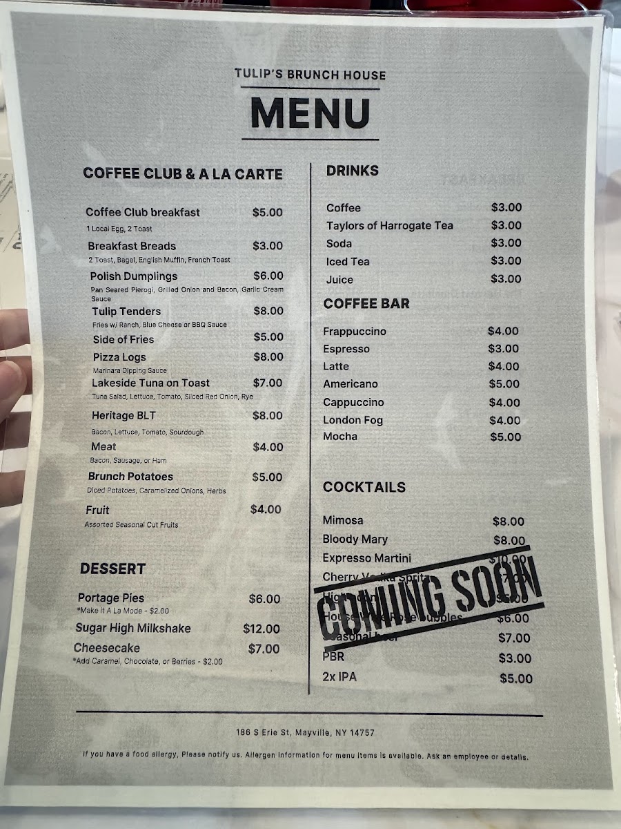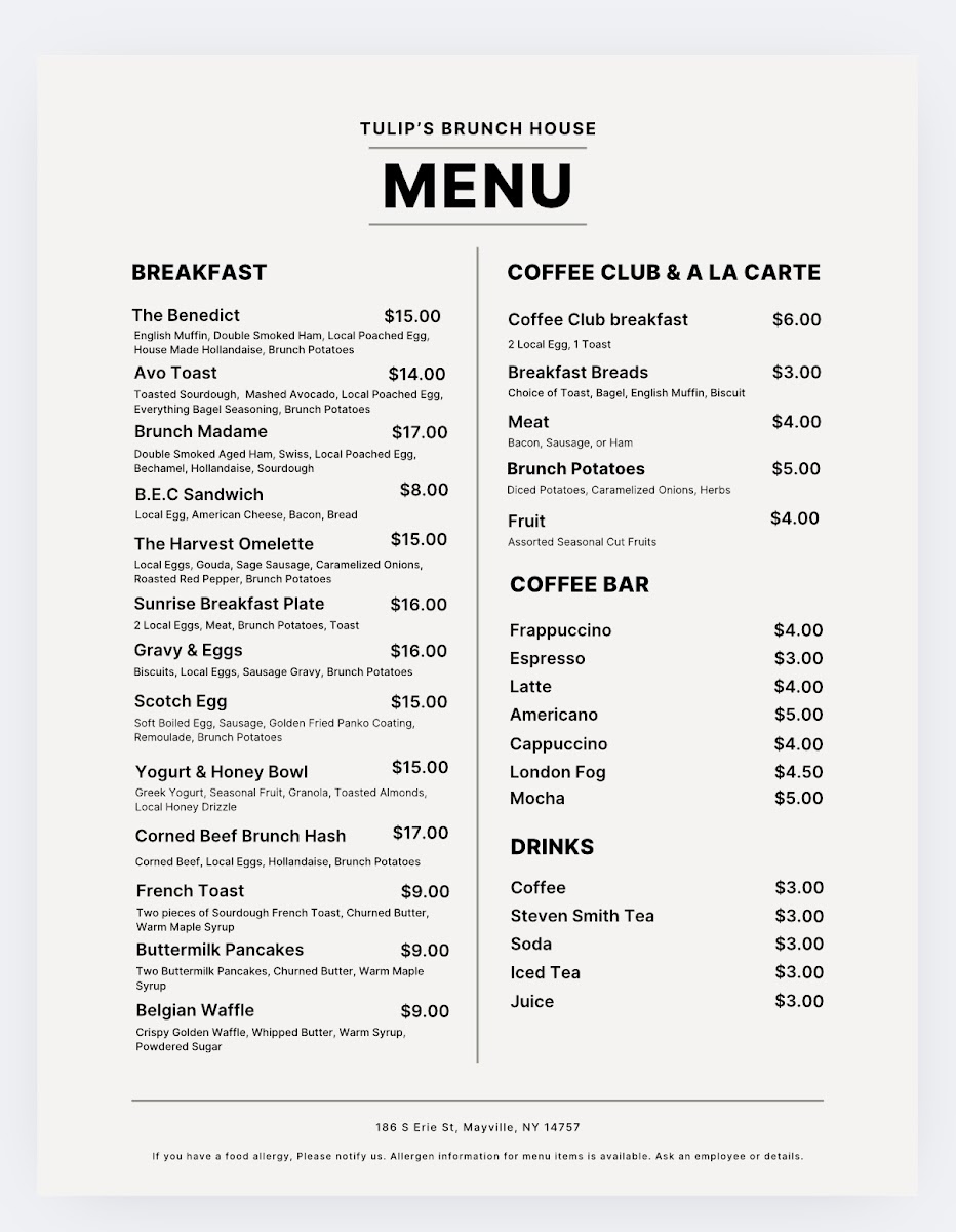 At Tulip's Brunch House Menu, located at 186 S Erie St, Mayville, NY, you'll find a delightful selection of dishes perfect for any brunch craving. Whether you're in the mood for a hearty, savory meal or something light and fresh, there's something to satisfy every appetite. From fluffy pancakes to flavorful omelets, each dish is crafted with care using the finest ingredients. And, of course, don't forget to pair your meal with one of their signature beverages-whether it's a freshly brewed coffee or a refreshing mimosa. The menu at Tulip’s is designed to offer comfort and joy in every bite, making it the perfect spot to gather with friends or family for a relaxed, delicious dining experience.